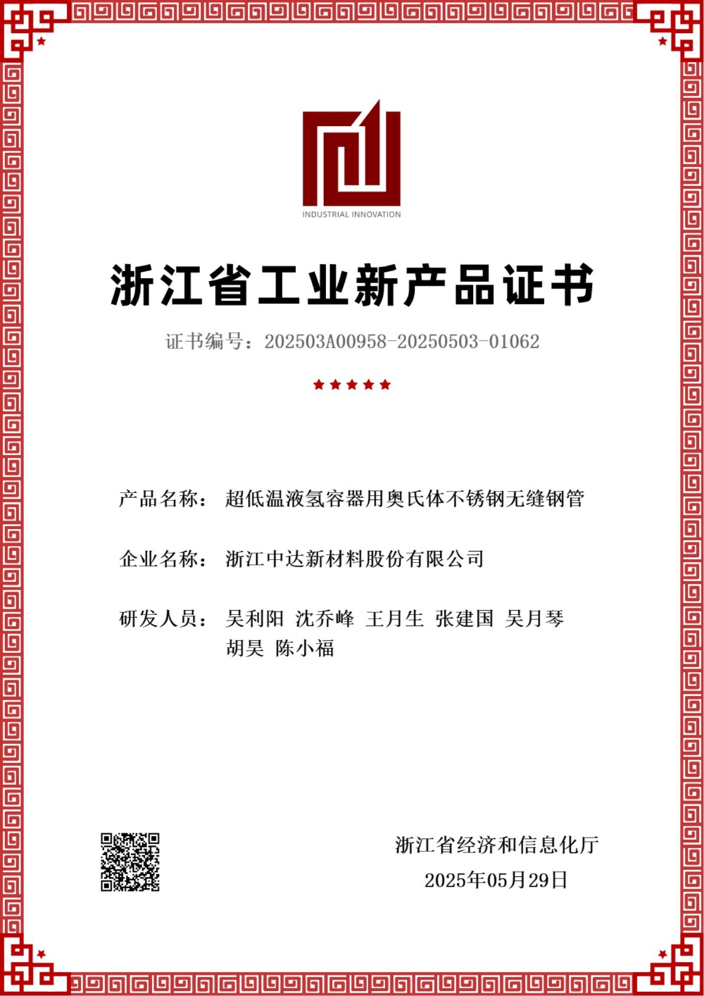 近日,中達(dá)新材再傳捷報(bào)!公司自主研發(fā)的超低溫液氫容器用奧氏體不銹鋼無(wú)縫鋼管和尿素級(jí)S31050奧氏體不銹鋼無(wú)縫鋼管兩項(xiàng)產(chǎn)品,成功通過(guò)浙江省經(jīng)濟(jì)和信息化廳的權(quán)威認(rèn)證,榮獲浙江省工業(yè)新產(chǎn)品證書(shū)。