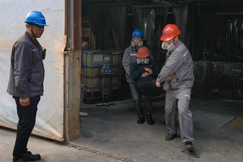 有限空間作業(yè)事故專項演練的地點為污水處理站,該演練事故情景為一名員工在污水處理池作業(yè)時,不明原因站立不穩(wěn)昏迷摔倒,被發(fā)現(xiàn)后監(jiān)護人員判斷該作業(yè)區(qū)域存在有毒氣體或缺氧。搶救人員需要穿戴好呼吸防護設(shè)備,沖入現(xiàn)場搶救人員,將昏迷人員移至空地,使人員平躺于地面,進行按壓急救。
