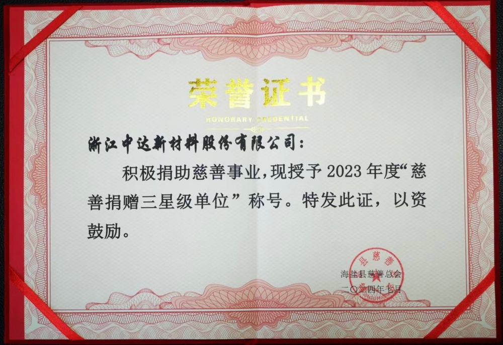 喜報(bào)!中達(dá)新材獲評2023年度慈善捐贈三星級單位
