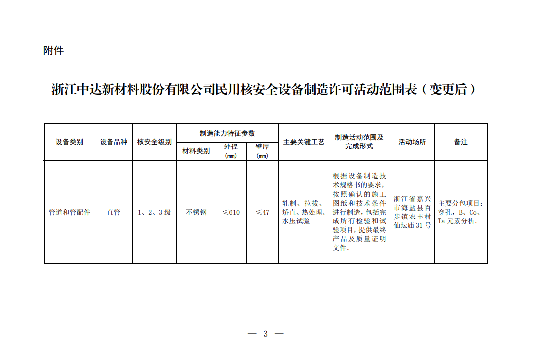 2025年4月,國家核安全局簽發(fā)了《關(guān)于批準(zhǔn)浙江中達(dá)新材料股份有限公司變更民用核安全設(shè)備制造許可活動范圍的通知》(國核安發(fā)〔2025〕59號),中達(dá)新材成功通過國家核安全局的嚴(yán)格審核,同意《民用核安全設(shè)備制造許可證》[國核安證字Z (23) 26號]變更為附件所列范圍。